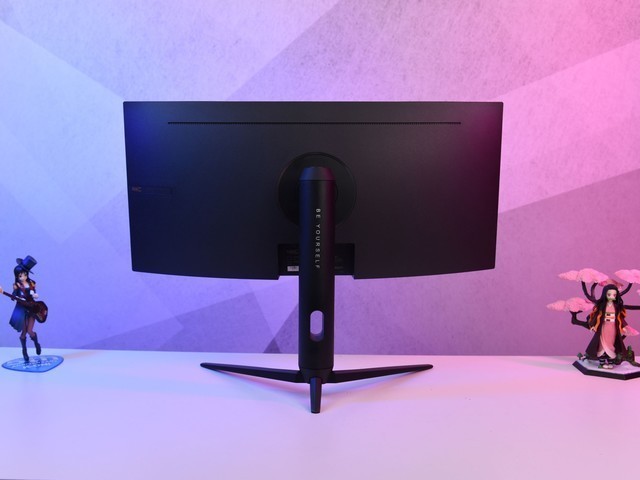 在背面的設計上,HKC CG301QL延續了前面板的風格。背部通體全黑,上方橫向有一行散熱口。背面正中間位置為支架連接區域,接口則布置在下方位置。
