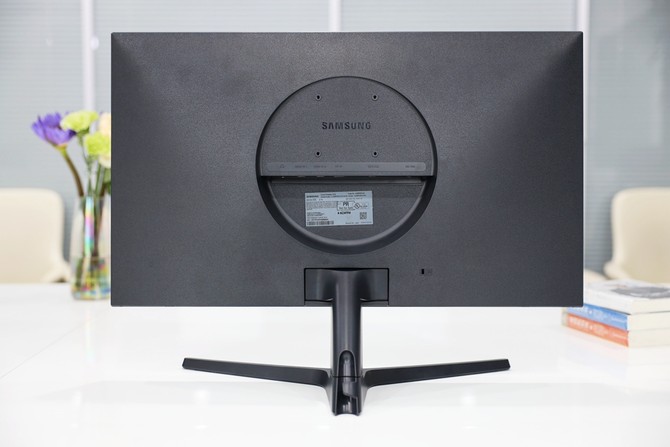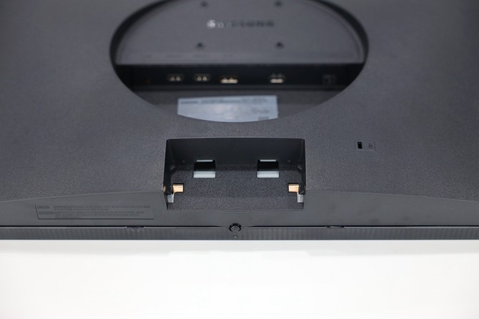 機身背面采用順滑的隆起設計,中間是一個很大的圓形,4顆預留螺釘口可用于壁掛支持,vesa接口規(guī)格為75mm×75mm;凹槽內(nèi)是電源和接口連接處,以及機器銘牌。機身規(guī)格為638.8 x 479.3 x 250.5 mm(含底座),整機重量約5.8kg。