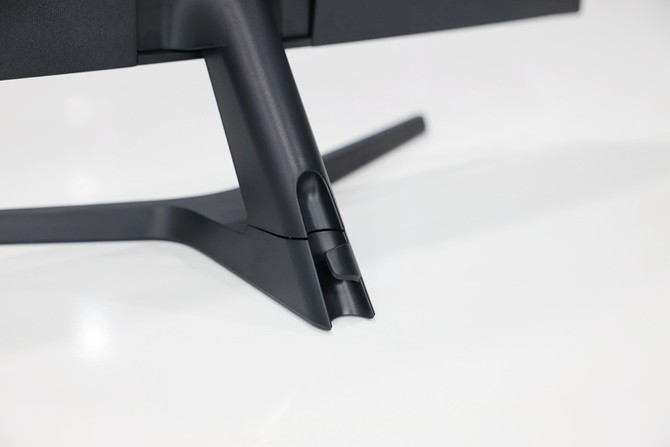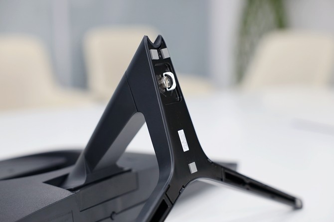 底座與支架的連接是一個快捷螺釘固定,無需工具,手動即可固定。安裝和拆卸都比較簡單,但是這樣的支架設計,也意味著顯示器不可調(diào)節(jié)高低,角度可調(diào)的范圍也比較有限。