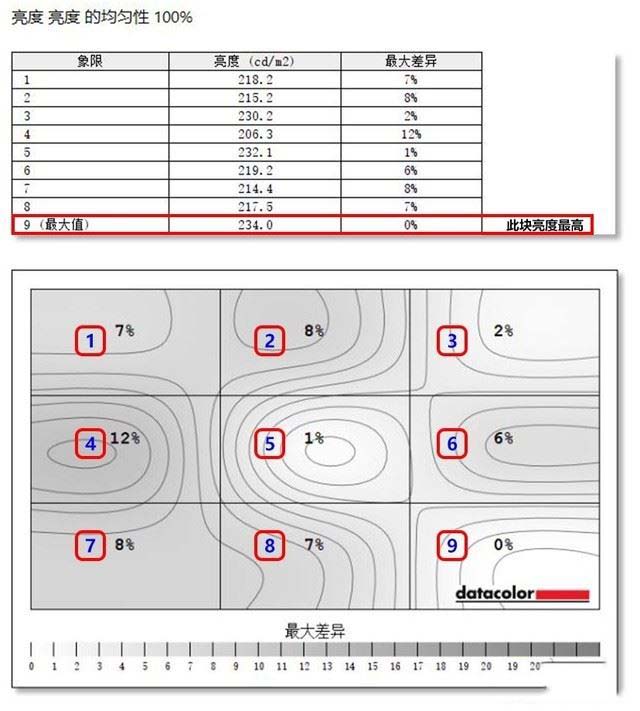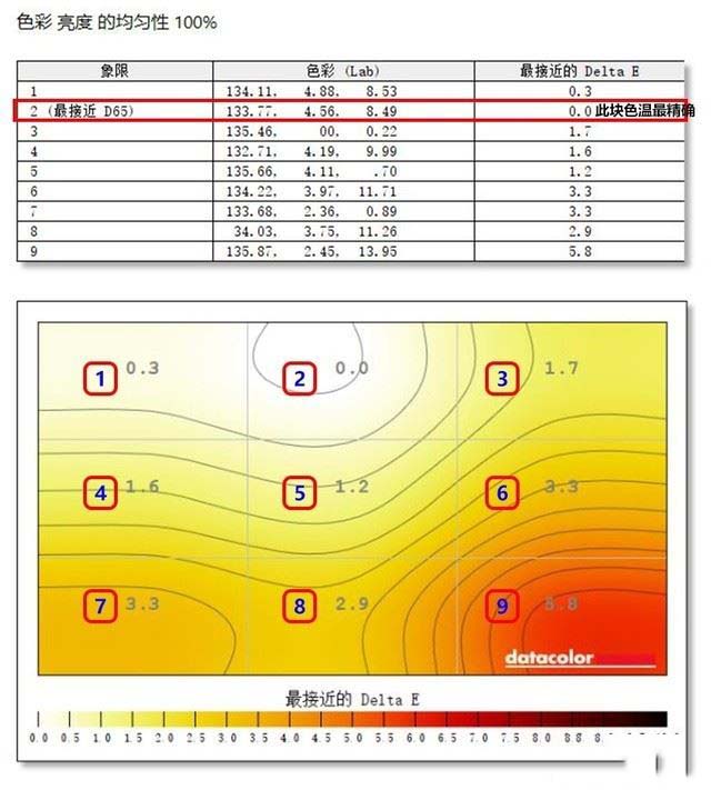 在色彩均勻性的測試中,可以看出顯示器左上角的2號區域最接近D65的標準,顯示器中間9號區域的色溫與標準色溫值有一定差距,差距數值為5.8,顯示器整體的色彩還是比較均勻的。