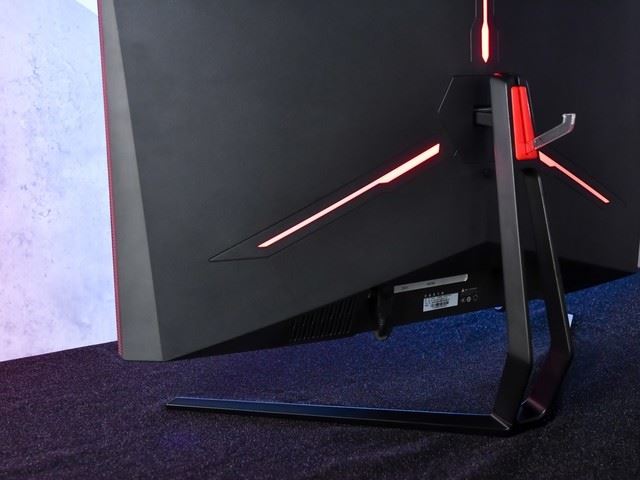下面讓我們來到顯示器的背面,顯示器背部采用ABS+PC高性能材料,整體是磨砂質感,背部光條造型也一改以往的單一的線條設計,融入更為立體的“線條藝術”,三條光帶電競范兒十足。