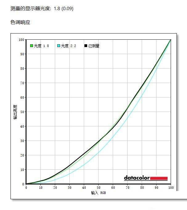 色調響應方面,已測量的黑色曲線應該盡量和淺藍色的“光度2.2”曲線保持一致,可以看到實測的黑色曲線和“光度1.8”曲線比較接近,表現一般。