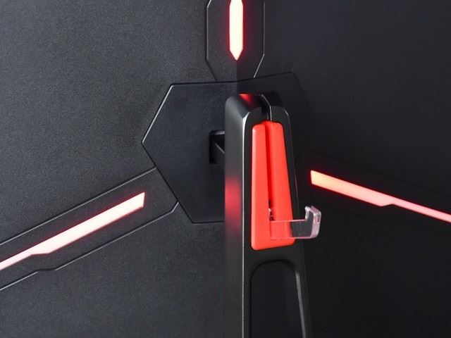 顯示器背后的支架上有一個可收納的掛鉤設計,可以將電競耳機掛在后面,非常的方便,只是這種透明的塑料材質在耐用性上有些不足。