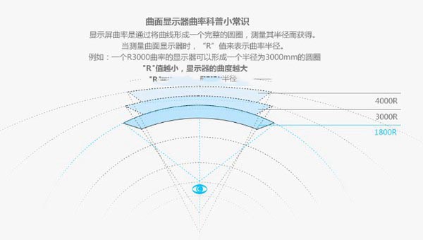 曲率決定著曲面顯示器的畫質和現場感,曲率的數值越小,彎曲的幅度越大。因此,理論上說,曲面顯示器曲率數值越小,顯示器弧度越大,相對來說,就越好了。