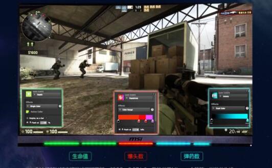 而微星這款屏幕最出彩的地方在于前面,機(jī)身正面配置五區(qū)RGB燈條設(shè)計(jì),玩家可透過微星獨(dú)家與SteelSeries賽睿合作的GameSense當(dāng)中設(shè)定RGB燈條來(lái)體現(xiàn)游戲中的血量、子彈數(shù)等,十分的炫酷。還可以根據(jù)自己的需求在軟件中進(jìn)行設(shè)置,總共五種燈條實(shí)時(shí)顯示,能很大提升游戲體驗(yàn)。