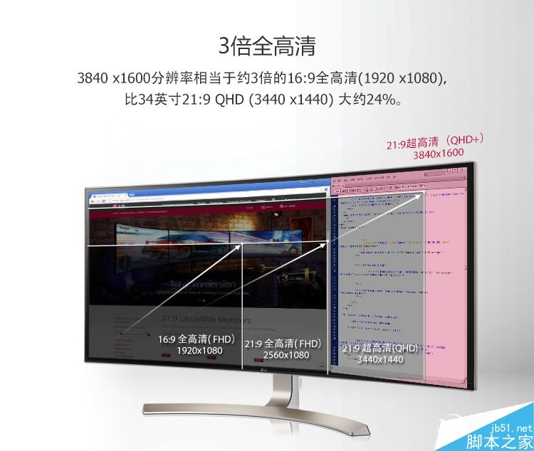 作為目前全球最大尺寸的21:9超寬屏顯示器,38UC99提供了非常可觀的屏幕顯示面積,擁有3840*1600的超高分辨率,相當于16:9全高清(1920x1080)的3倍,且比34英寸21:9 QHD(3440x1440)還要大24%。