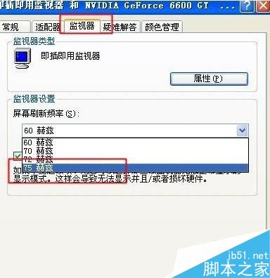 3、進入高級設置選項卡后,點擊監視器選項卡,選擇屏幕刷新頻率為75赫茲。注意一點的是并不是說60赫茲就會出現一閃一閃的情況。