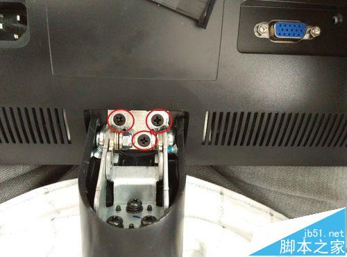 13、可以看到三顆螺絲。如下圖紅圈所示。這三顆螺絲即連著底座支柱,也固定著正面金屬罩。把這三顆螺絲擰下來。
