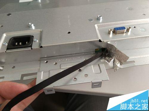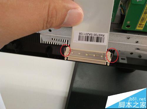 7、再找到連接液晶屏的信號線,把它取下來。注意這條線的接口是有兩個卡扣扣住的,所以在取的時候不能用蠻力扯,要按住兩邊的卡扣再拔出來。