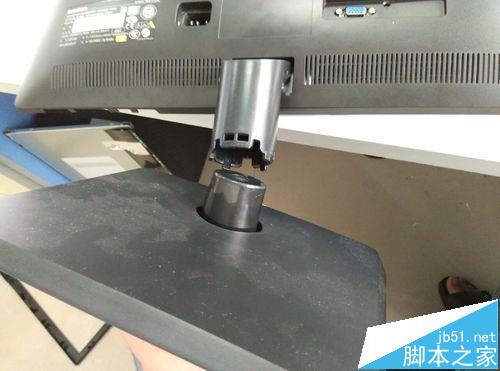 10、顯示器底座朝上,用手往里掰住下圖紅圈所標注處的卡扣。把底座往上提,即可把它取下來。