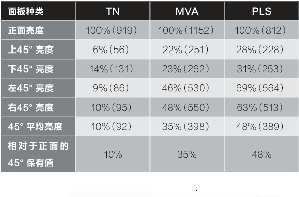 我們先看一下TN MVA PLS可視角度對比參數對比: