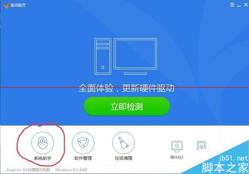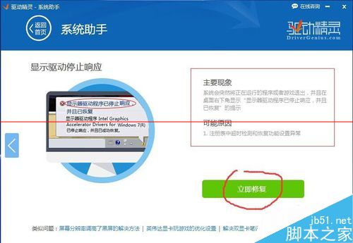 2、安裝完后打開驅動精靈軟件,點擊窗口左下角“系統助手”,然后找到“顯示驅動停止響應”,點擊圖標進入或者點“立即修復”