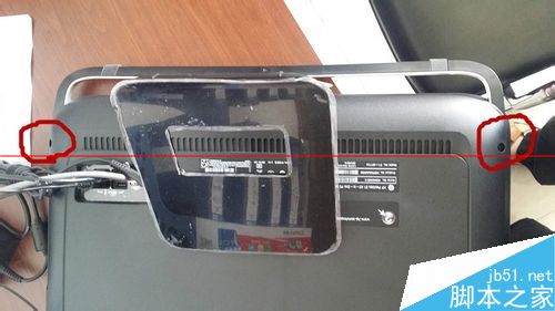 3、在一體機(jī)的底座中間有一個(gè)活扣,在螺絲完全扭開(kāi)的情況下,用力按下這個(gè)活扣,機(jī)箱下部會(huì)稍稍彈起一點(diǎn)。