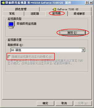 (2)、若在可選擇的分辨率中未找到需要的分辨率,點擊“高級”,在新彈出的窗口中選擇“監視器”,將“隱藏該監視器無法顯示器的模式”勾選取消,點擊“應用”,然后再嘗試設置分辨率。若此選項為灰色,可點擊“屬性”,使用顯示器附贈光盤,安裝正確顯示器驅動程序嘗試。