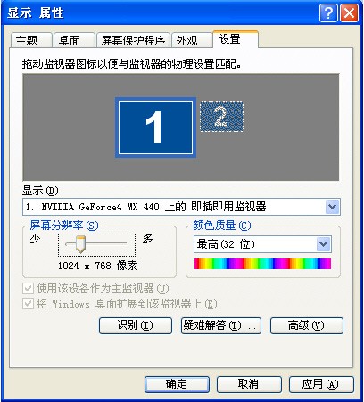 在系統桌面點鼠標右鍵,選擇“屬性”進入“顯示屬性”菜單,選擇“設置”,在這里可以設置分辨率大小和顏色質量。一般而言,對于15″顯示器。推薦使用800×600分辨率,由于15″顯示器的屏幕較小,點距較大,如果把分辨率設成1024×768,則顯示的字體非常模糊,極傷視力。17″顯示器推薦使用1024×768分辨率,這是目前大家使用的主流分辨率(如圖8)。