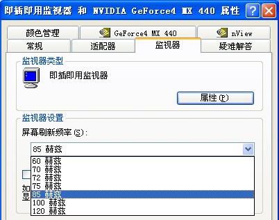 在圖8中點“高級”按鈕進入顯卡驅動屬性設置,點“監視器”選項,然后在“屏幕刷新頻率”的下拉菜單下選擇合適的刷新率(如圖9)。一般要保證刷新率在75Hz以上,刷新頻率的大小要參考顯示器的說明設置,千萬不要盲目設置,如果設置的刷新率大于顯示器所支持的大小,那么顯示器將會黑屏無法顯示。