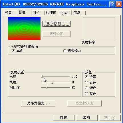 鑒于以上情況,在顯卡驅動屬性里,我們可以對顯示器亮度和對比度等進行調節,以筆者的集成顯卡為例(nVIDIA和ATI顯卡方法類似),進入驅動屬性設置的“顏色”選項卡,在“灰度校正”中,點選“桌面”,然后通過鼠標拖動滑塊可自己設置顯示器的灰度、亮度和對比度(如圖10)。然后進入CS或自己喜歡的游戲反復調整,設置后好另存為“color1”。這樣調節后,在玩CS時躲藏在陰暗角落里的敵人也被看得一清二楚。