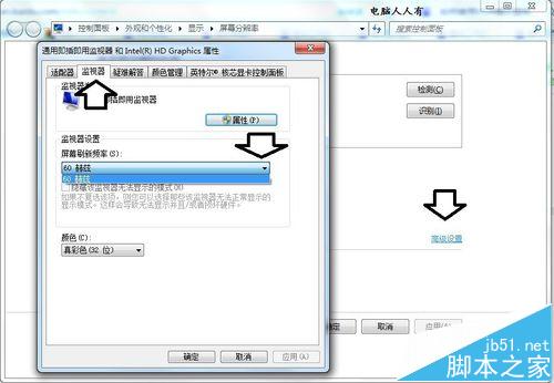 4、還有一種情況,用戶擅自修改刷新率(調高),也會導致顯示屏出現:超出工作頻率范圍的提示。調整方法:高級設置→監視器→屏幕刷新頻率→60→確定。