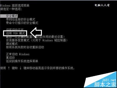 8、如果是重啟電腦之后顯示:超出工作頻率范圍的提示。那么第一時間長按開機鍵,關閉電腦,再按開機鍵,重新啟動,馬上按F8鍵,使用上下鍵選擇:啟用VGA模式(通常在Windows XP 操作系統的啟動管理菜單中才會有)即可。