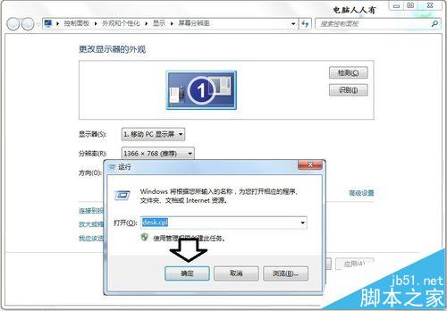 3、如果還能進操作系統,那就在運行中輸入:desk.cpl →確定,打開設置分辨率的設置項→返回適合當前顯示器的分辨率(通常是調低)。