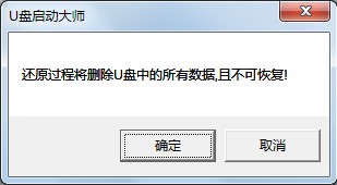 還原第5步:然后將會看到一個關于數據備份的提示,請確認您U盤中的數據已經做好備份。點擊“確定”即開始還原