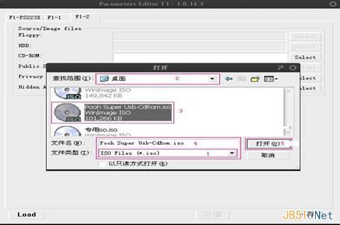 然后,根據1-5序號進行操作;此選項目的是選擇量產所需的ISO鏡像文件(如圖6)
