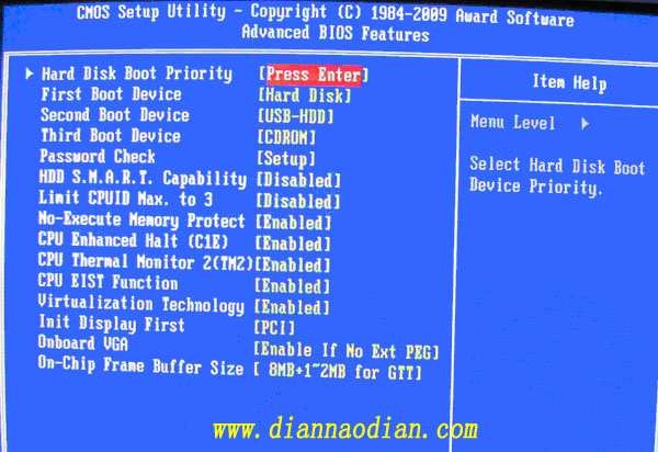 上圖2:高級BIOS設置(Advanced BIOS Features)界面,首先選擇硬盤啟動優(yōu)先級:Hard Disk Boot Priority
