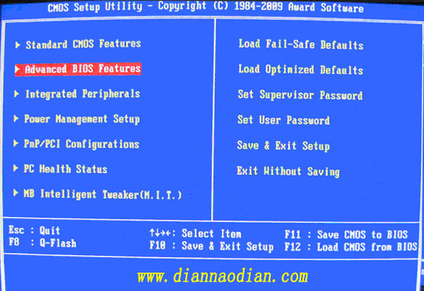 2、舊的Award BIOS(2009年電腦主板):下圖5:開機按Del鍵進入該BIOS設置界面,選擇高級BIOS設置:Advanced BIOS Features