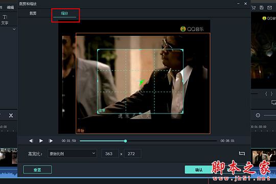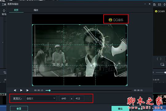 3、彈出裁剪和縮放的界面后,由于軟件默認的高寬比是原始比例,不管怎么調整都是保持縱橫比例的,所以需要將高寬比設置為自定義,并調整圖中淺藍色的框,使水印部分排除在選框之外,這樣裁剪后的視頻將不再出現水印部分,如下圖所示:
