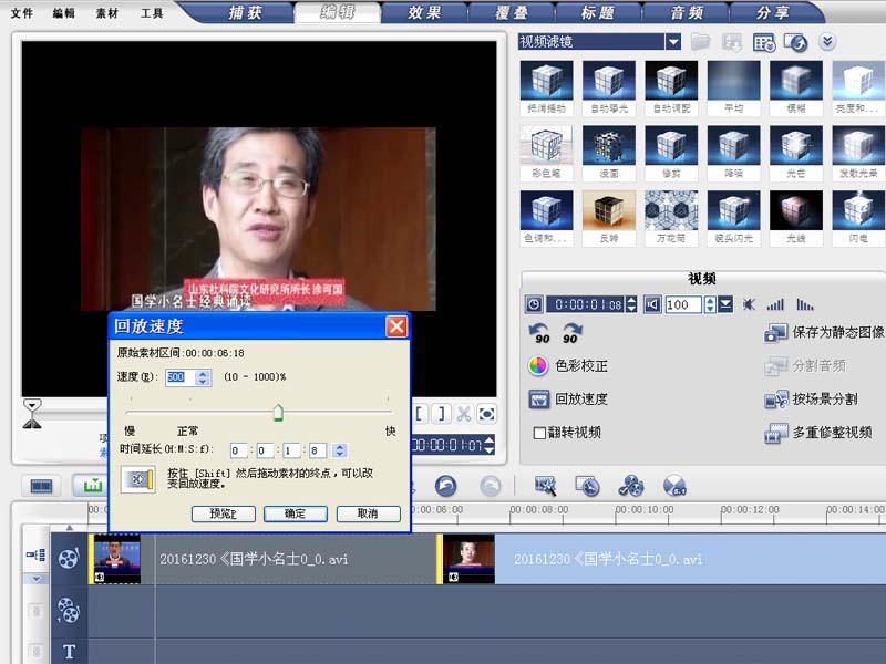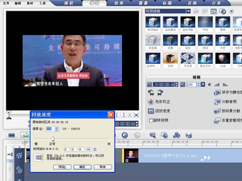 3、選擇前半部分,切換到視頻選項卡,點擊回放速度,調出回放速度對話框。