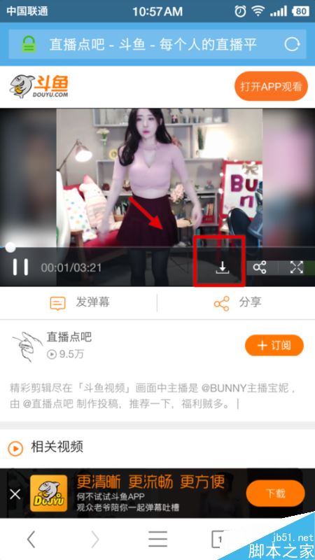 然后我們找到手機上的UC瀏覽器,把剛剛復制的網址在瀏覽器中打開。這個時候出人意料的事情發上了,視頻上面多了一個下載的【↓】的按鈕,點擊下載即可。