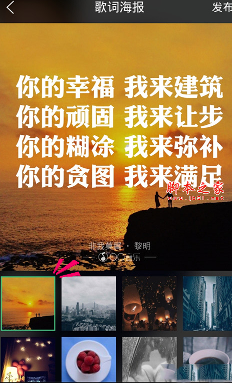 8、設置好歌詞海報怎么發布和保存呢?點擊右上角的[發布],既可以分享給QQ好友,微信朋友圈,微博等社交,同時會生成圖片保存到手機上