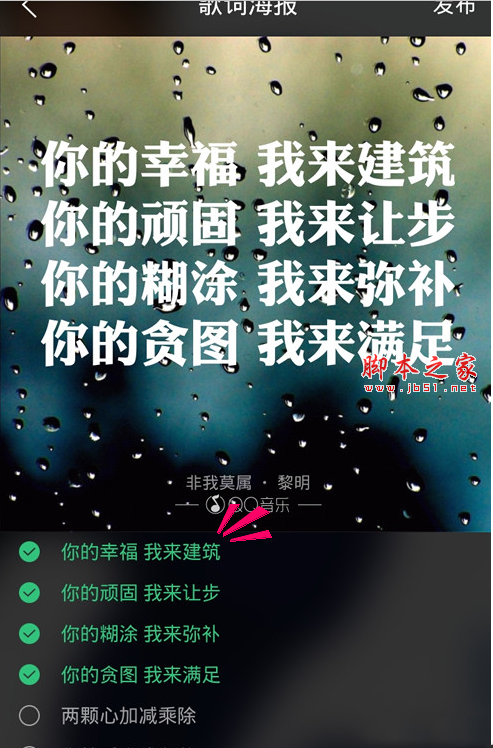 6、歌詞海報的主角當然是歌詞了,所以當你選擇一首歌曲之后,重點是選擇歌詞,被你選擇的歌詞會顯示到海報的中間,當然歌詞可以選擇一句也可以是多句。