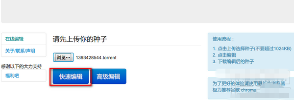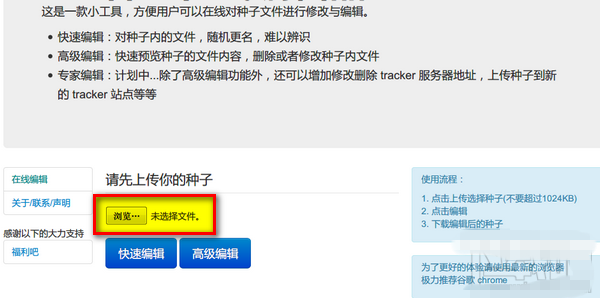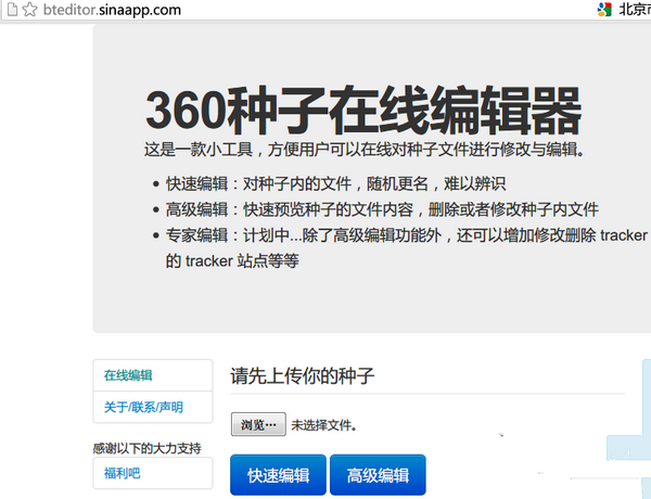 打開網站:http://bteditor.sinaapp.com 這個是一個簡約的清洗你的BT種子的網站,擁有 快速編輯 和 高級編輯 功能,一般就能解決大部分的問題,處理后的文件就能離線了,就是文件名是隨機的,成功率還是挺不錯的。