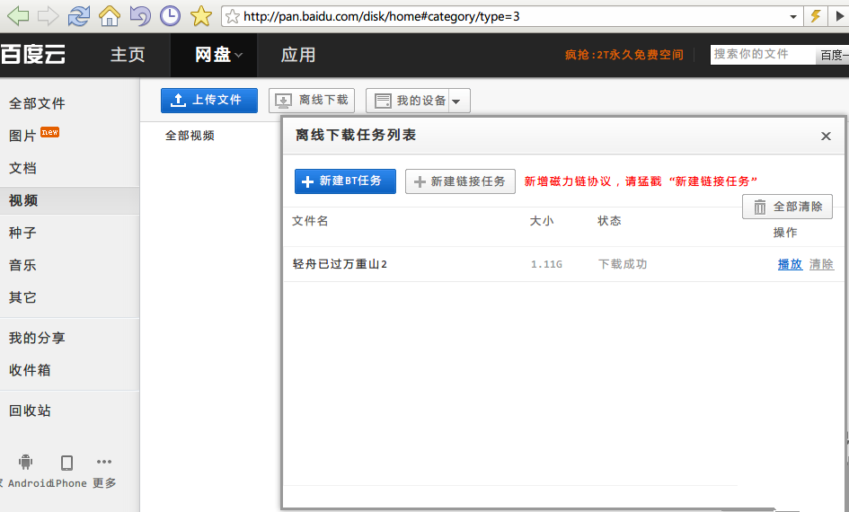 6:百度盤的離線里添加BT種子,離線好,可以播放了哦,哈哈,真爽!