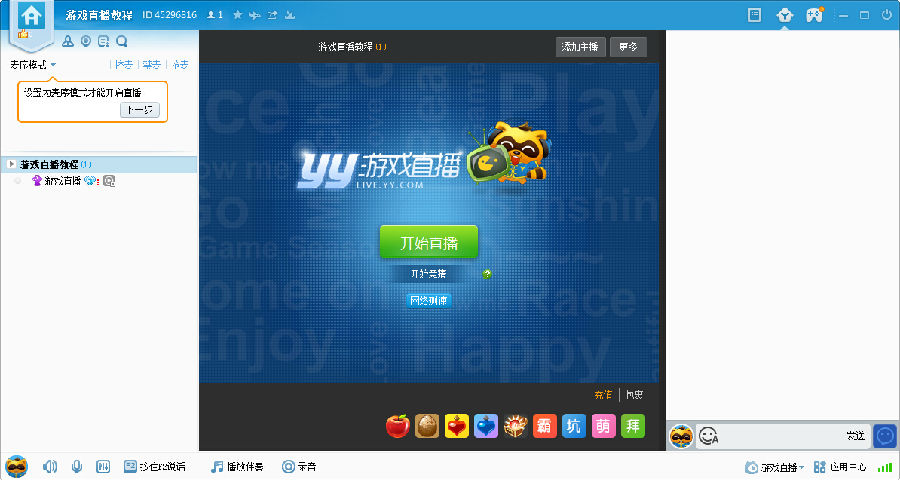 本教程適用于對YY有一定了解,熟知頻道和公會概念的用戶。采用本教程的方式直播,您可以體驗更豐富的互動玩法。如果您希望用更簡單的方式直播,請參考:[ YY直播助手怎么用?歪歪直播助手使用教程 ]