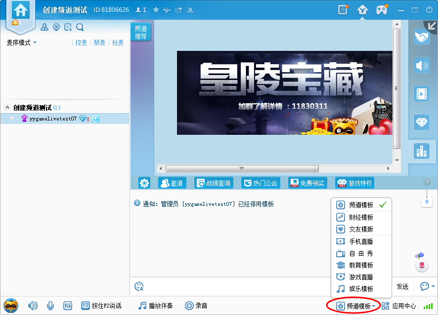 Step4:頻道管理員登陸YY進入頻道,在頻道下方“頻道模板”處選擇“游戲直播”模板,這樣頻道就擁有了游戲直播的權限。