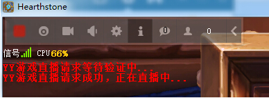Step11:點擊直播工具欄的綠色開始按鈕,進行游戲直播,紅字提示“YY游戲直播請求成功,正在直播中...”表示直播已成功開始。