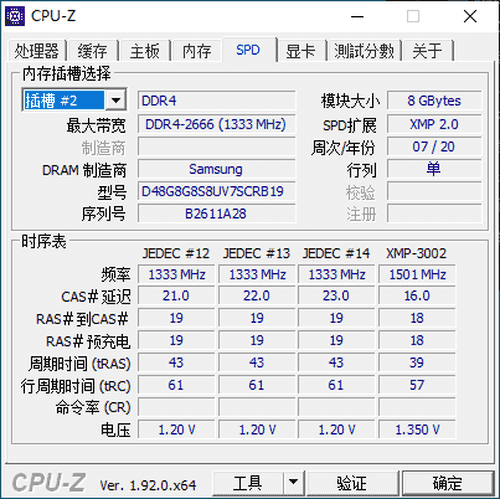 通過CPU-Z這款軟件可知,這款內存選用的是韓國三星的DDR4內存顆粒,品質值得信賴。其支持XMP 2.0技術,在3000MHz工作頻率下,該內存的工作時序為16-18-18-39。