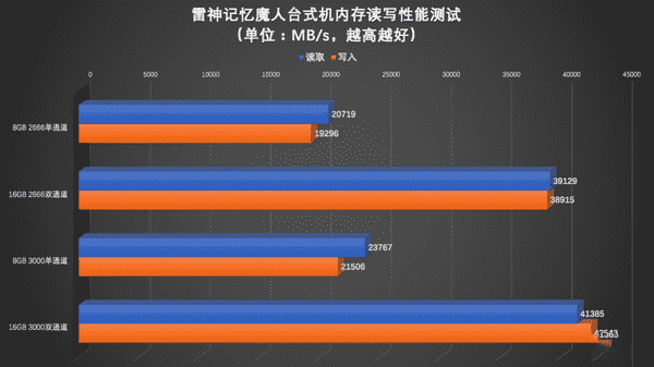 通過雷神記憶魔人臺式機內存的理論性能測試可以看出,內存超頻可以帶來超過10%的讀寫性能增強;從單通道升級為雙通道帶來的提升則更為明顯,在不同內存頻率下讀取速度幾乎翻了一倍。因此,配合SSD可以讓程序啟動、加載更為順暢。