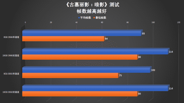 玩游戲最影響體驗的便是卡頓。而造成卡頓除了網絡原因外,很有可能是在某些場景下游戲幀數驟降導致的。換言之,PC運行游戲是否順暢,除了看平均幀數外,還需要關注其最低幀數。通過測試可以看到,同樣是內存單通道,超頻至3000MHz后,相比默認的2666MHz工作頻率,幀數提升了11。另外,內存雙通道對比單通道的提升同樣十分顯著。