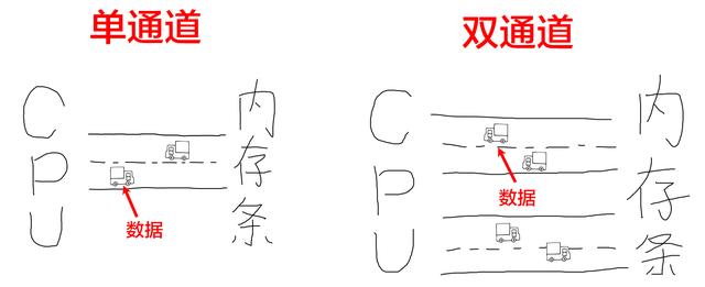 CPU與內存條之間的數據傳輸是有來有回的,單通道就相當于一條馬路分左右車道,一個車道負責去,一個車道負責回。 雖然秩序井然但是由于馬路(帶寬)較窄,數據流量不會很大。