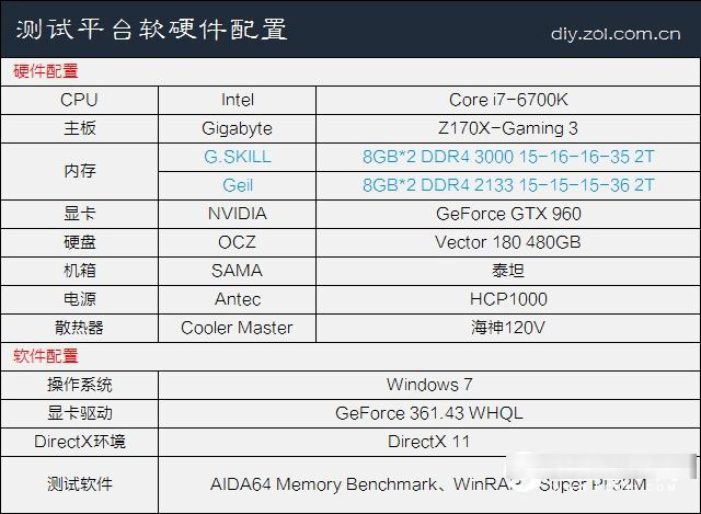 測試平臺方面,為了最大限度減少平臺對內存性能的發揮造成的瓶頸,測試使用了Intel Z170+Core i7-6700K處理器,CPU保持默認頻率,搭配GeForce GTX 960顯卡,顯卡核心和顯存頻率分別為1216/1279MHz和7012MHz。