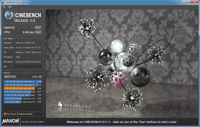 CineBenchmark是業界公認的基準測試軟件,在國內外主流媒體的多數系統性能測試中都能看到它的身影。它使用該公司針對電影電視行業開發的Cinema 4D特效軟件引擎,可以測試CPU和顯卡的性能。其中單顆核心和多顆核心的測試是單獨計算得分的,除此之外,其還提供了OpenGL的測試。
