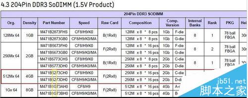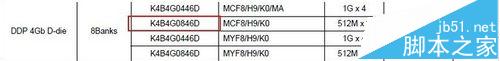2、這個是從三星下載的表格,紅色框中表示與你這個編號最為相近的顆粒,同樣表明該型號內(nèi)存需要16顆256m的顆粒才能組成單根4G的內(nèi)存條。這個內(nèi)存與貼紙的型號是不符的,所以是假貨