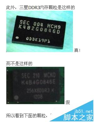 5、下面看下上傳的水貨條的顆粒。可以說,這個顆粒跟我常見的三星內(nèi)存顆粒完全不同,常見怎么樣的,見右邊的原裝內(nèi)存。這條假的顆粒為K4B4G0846E和正常的顆粒的差別在于最后一個E,這個E是代表一種Die的封裝形式。不過從編號上看是沒有問題的。哦,還有個MCK0.好吧,M代表的是DDP,CK0可以理解成1600.從顆粒來看,這個條子似乎也滿足4G的容量。