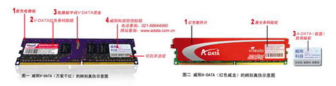 其實分辨真偽威剛內存十分簡單。拿到一款威剛內存產品首先通過肉眼觀察,從內存貼紙上的防偽電話到外包裝的設計,真假產品都能看出不同。首先從防偽標識和防偽電話說起,威剛“萬紫千紅”系列內存整個PCB板以紫色為主,電路板中間有V—DATA的燙金標志,內存顆粒上貼有V—DATA的紅色條碼貼紙和威剛科技的防偽貼紙,防偽貼紙上標明了查詢電話和網站地址以及可刮開圖層的防偽碼。威剛“紅色威龍”在綠色PCB板層外加裝了紅色的散熱片,散熱片正面貼有激光條碼貼紙,背面則是防偽貼紙。如果從外觀上無法區分真假,那么防偽貼紙上查詢電話和可刮開的防偽碼則能幫您徹底的弄清產品的真偽。
