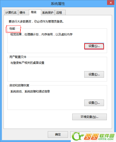 第三步:進入到系統屬性界面,在性能選項點擊“設置”。
