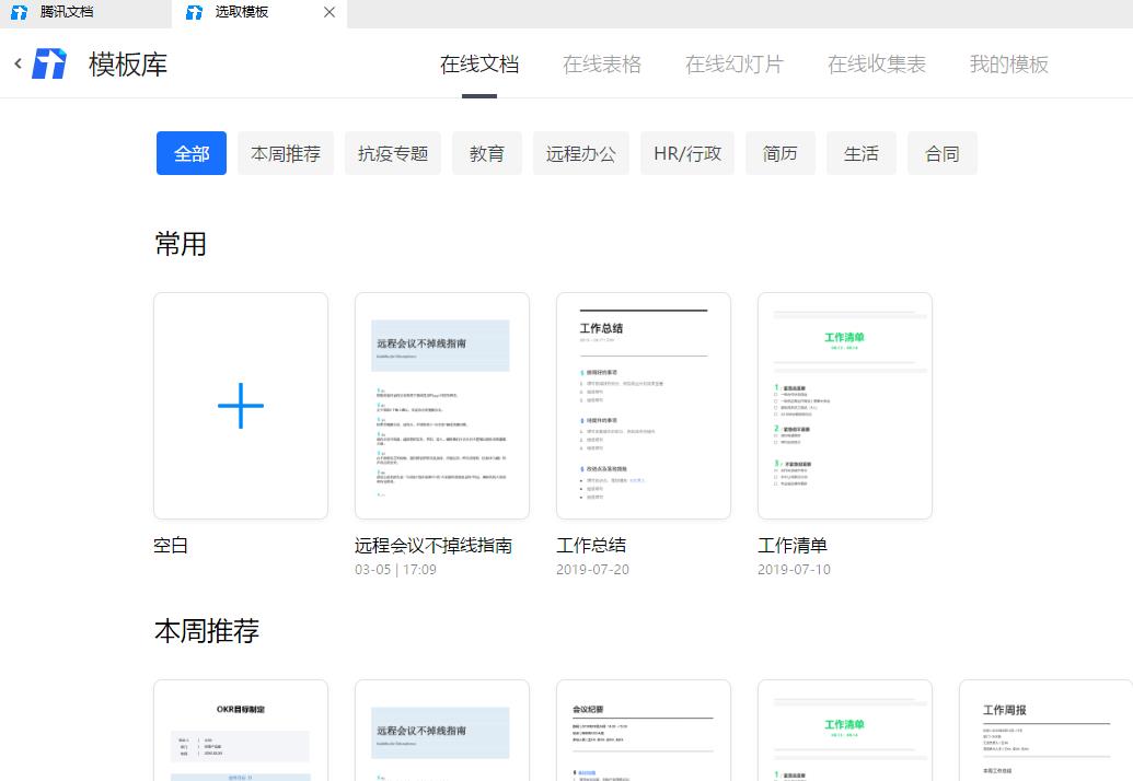 2、在加載出的模板庫界面,選擇在線文檔所需要用的模板。