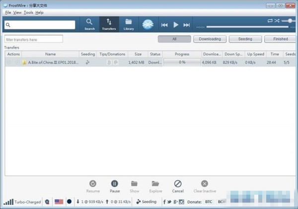 FrostWire正在進行BT下載。下載文件需要一定的時間,請耐心等待。